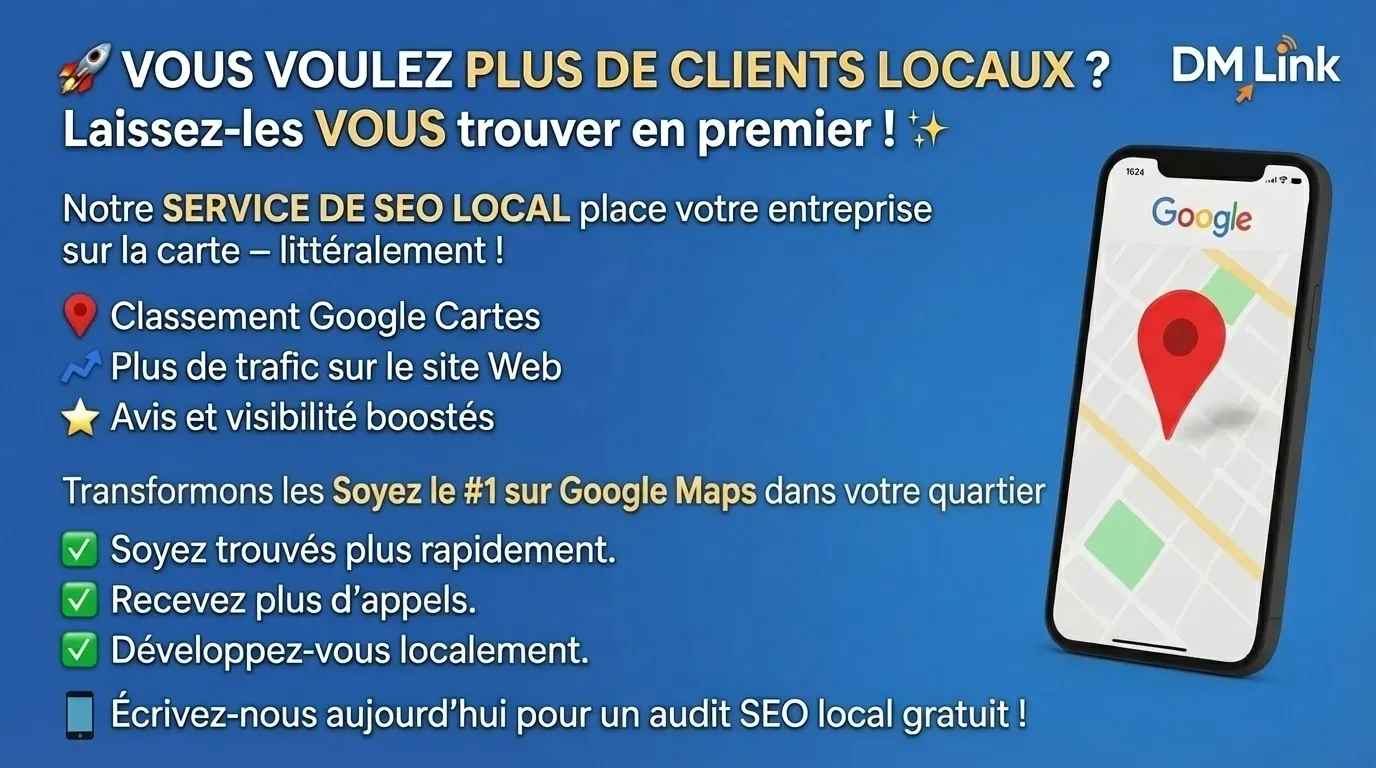 Prêt à dominer les recherches locales au Québec? Contactez The DM Link pour un audit gratuit de votre présence locale et découvrez comment nous pouvons transformer votre visibilité en ligne en croissance business réelle. Votre prochaine vague de clients locaux n'attend que d'être conquise.